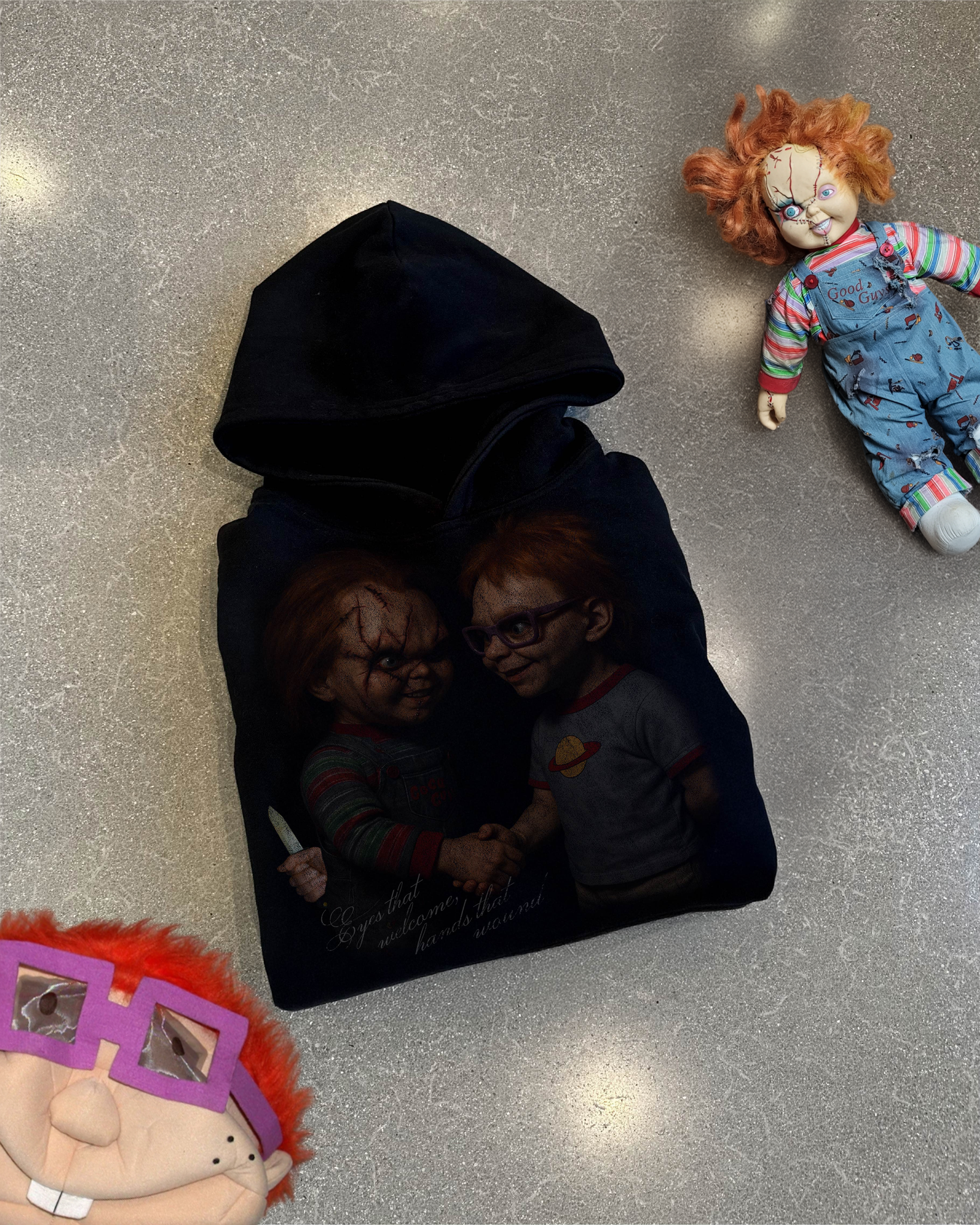 Black Pullover hoodie with vintage distressed print and text saying "Eyes that welcome, hands that wound".