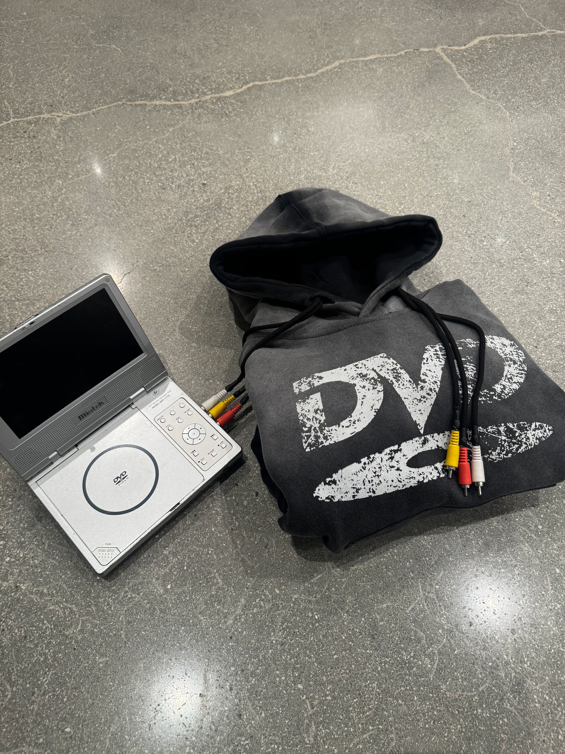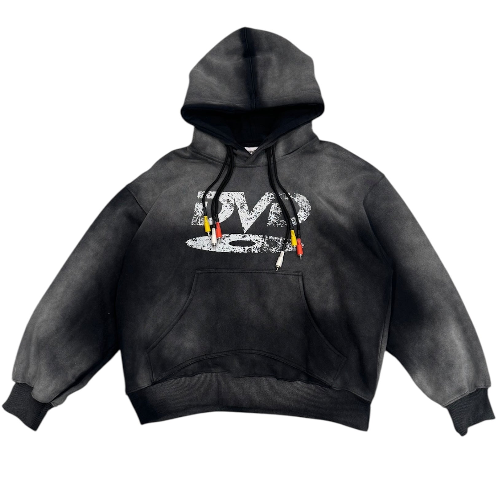 Vintage washed pullover hoodie with 6 RCA cable drawstrings. Custom shaped front pocket and printed retro logo. Authentic RCA tips, dry clean only.