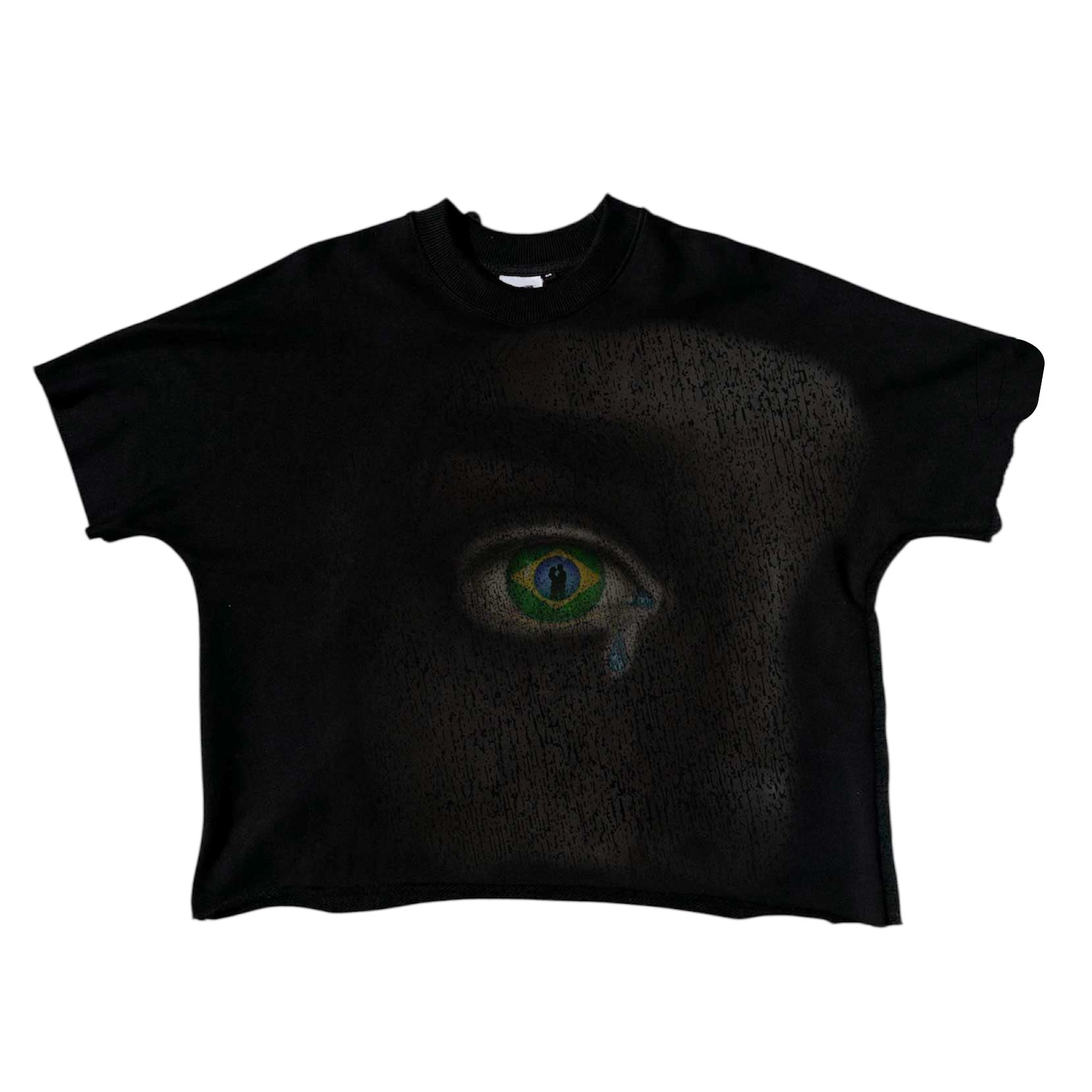A crying eye designed as Brazil's flag with the reflection of 2 people kissing in the pupil. Symbolizing someone is deeply saddened by the actions they are witnessing.